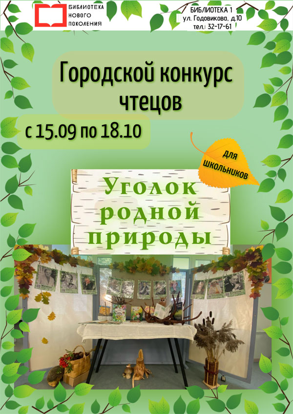 Библиотека № 1 на улице Годовикова, дом 10, приглашает принять участие в городском конкурсе чтецов «Уголок родной природы», приуроченному к проведению Недели вологодской книги.