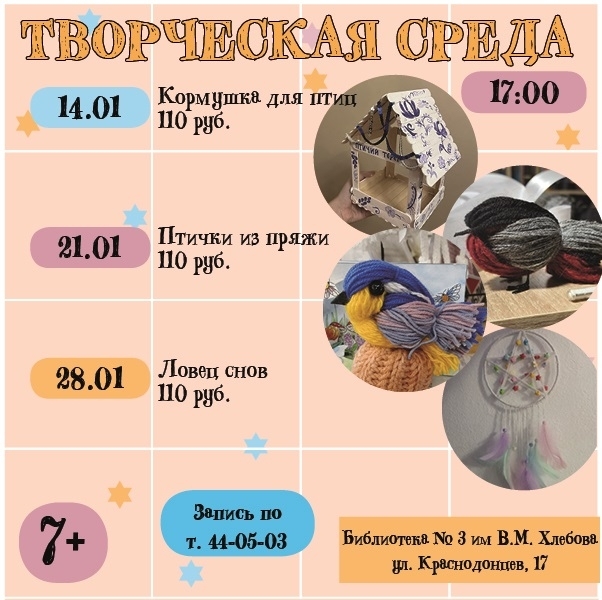 Библиотека №3 им. В.М.Хлебова на Краснодонцев,17 приглашает погрузиться в «Творческую среду».Спешите записаться на первые зимние мастер-классы 2026 года от мастеров библиотеки.