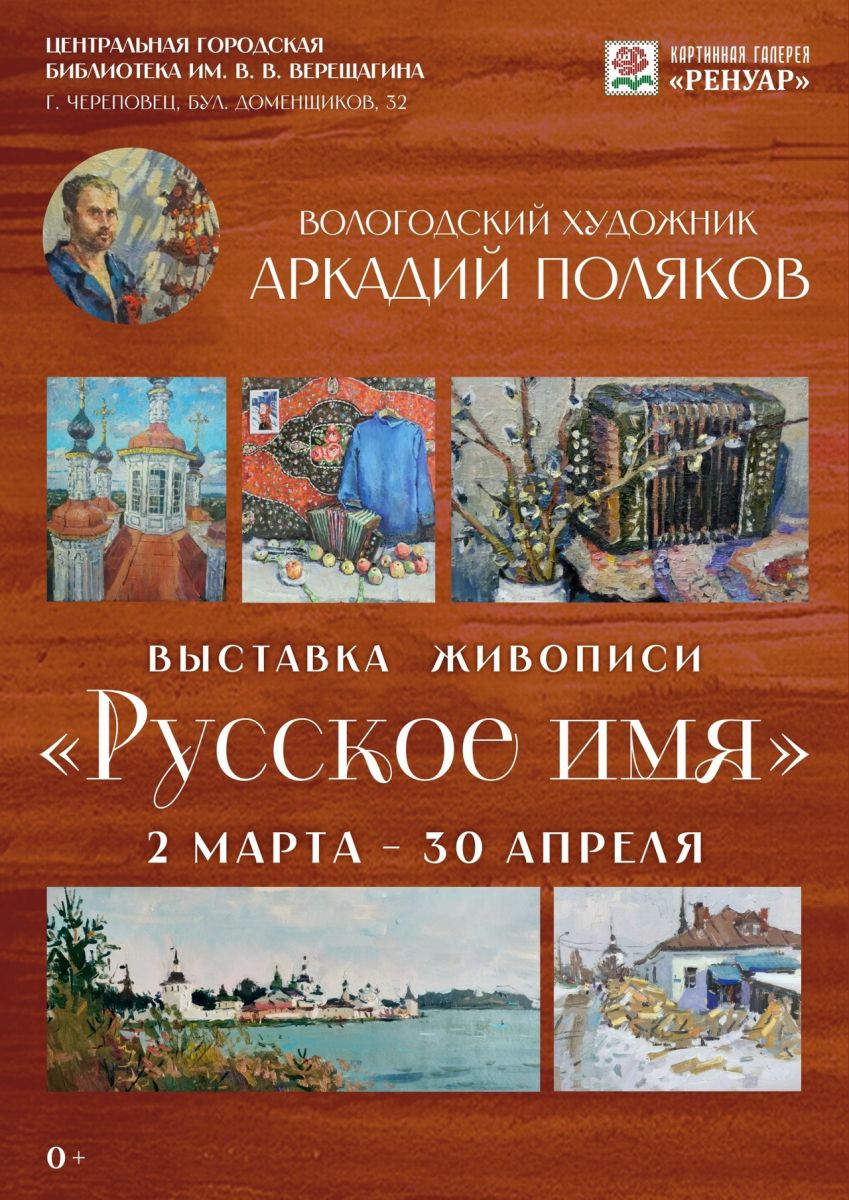 Натюрморты, портреты, пейзажи, посвященные жизни Вологодчины, красота северного края, города и люди вологодской земли - всё это "Русское имя", представленное на живописных полотнах Аркадия Полякова.