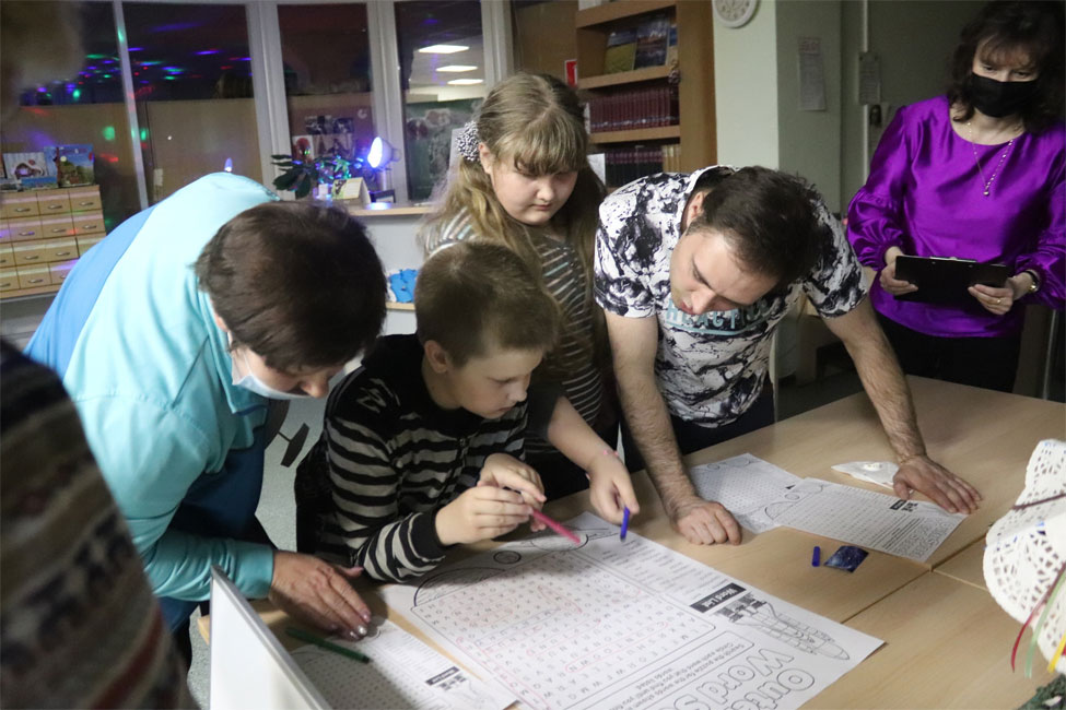 В отделе литературы на иностранных языках станция называлась «Milky Way» («Млечный путь»). Вкусное название, любимое лакомство каждого ребёнка, да и взрослого тоже. Участники квеста разгадывали кроссворд «Outer Space» («Космическое пространство»). Среди множества букв нужно было найти и обвести 28 слов на английском языке, которые были связаны с космосом. Например: спутник, посадочный модуль, запуск, орбита, комета, шаттл, звезда, солнце, названия планет. Дети составляли картинки с изображением космонавтов из 20 пазлов. Если быстро справлялись с заданием, в некоторых группах взрослые угадывали песни по мелодии. (А. Герман «Надежда», М. Боярский «Большая медведица», «Земляне» – Трава у дома, Л. Лещенко «Мы – дети Галактики», «Лунная соната» и т.д. )