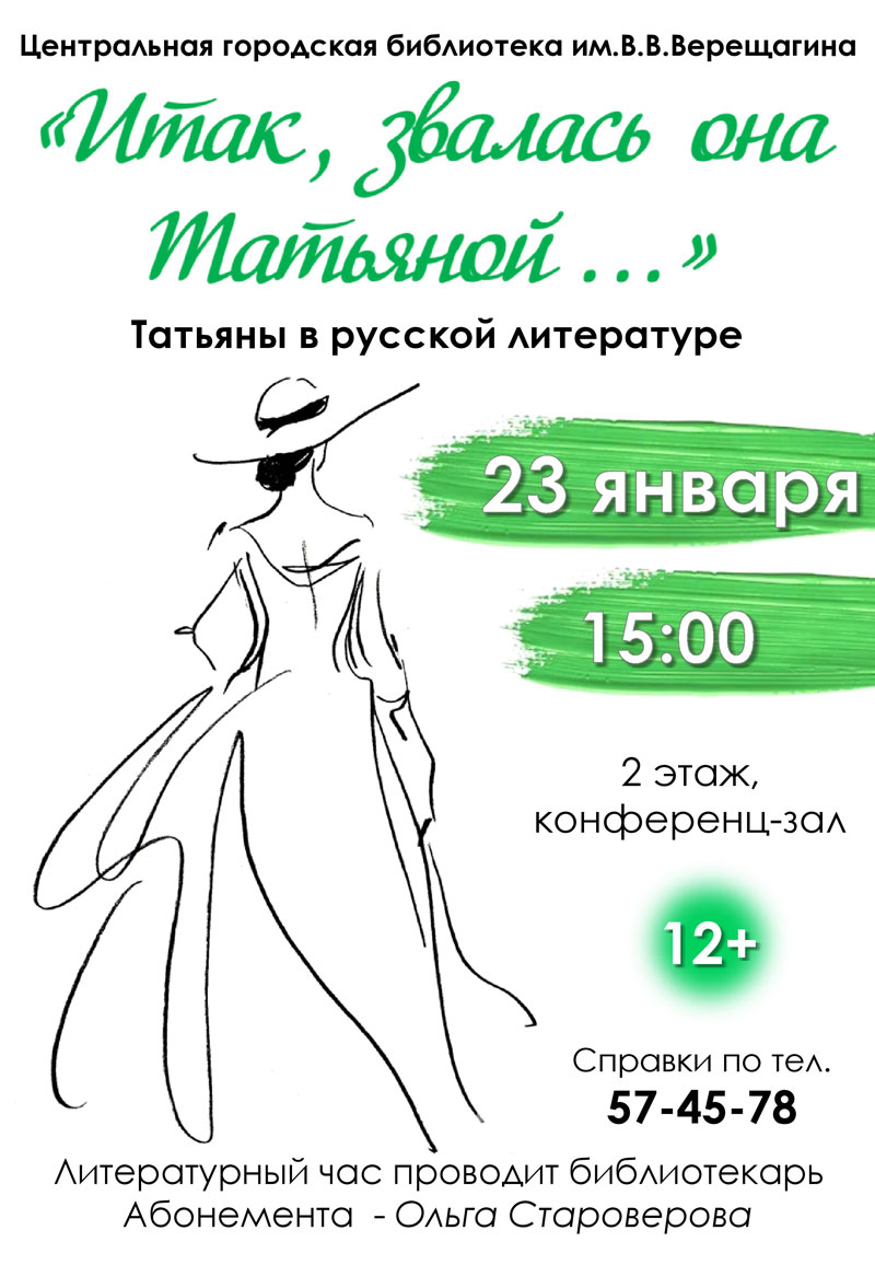 В преддверии Дня студента или Татьяниного дня в Центральной городской библиотеке им. В.В.Верещагина пройдет литературный час «Итак, звалась она Татьяной...».