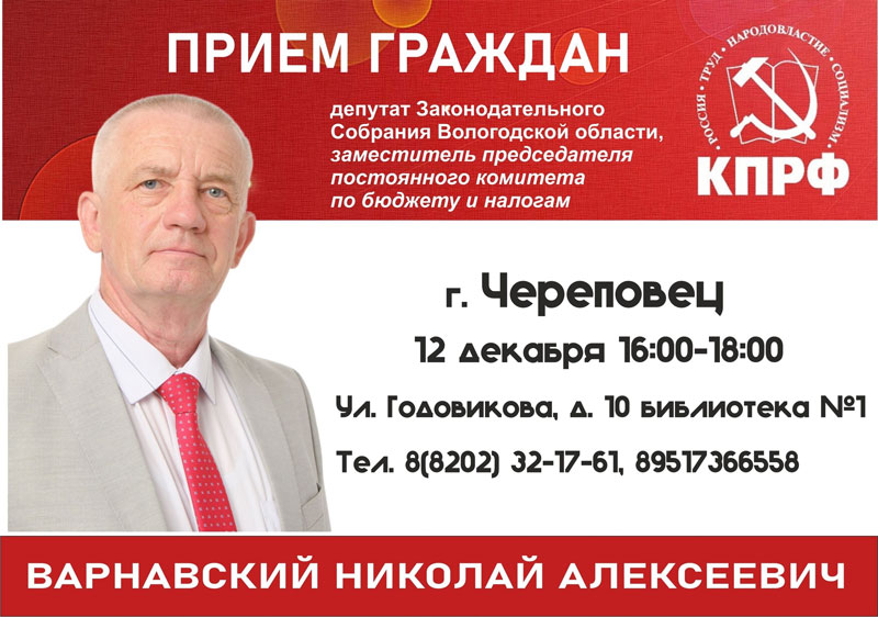 Депутат Законодательного Собрания Вологодской области, заместитель председателя постоянного комитета по бюджету и налогам Варнавский Николай Алексеевич (КПРФ) 12 декабря с 16:00 до 18:00 проводит прием граждан в помещении Библиотеки №1 (ул. Годовиков